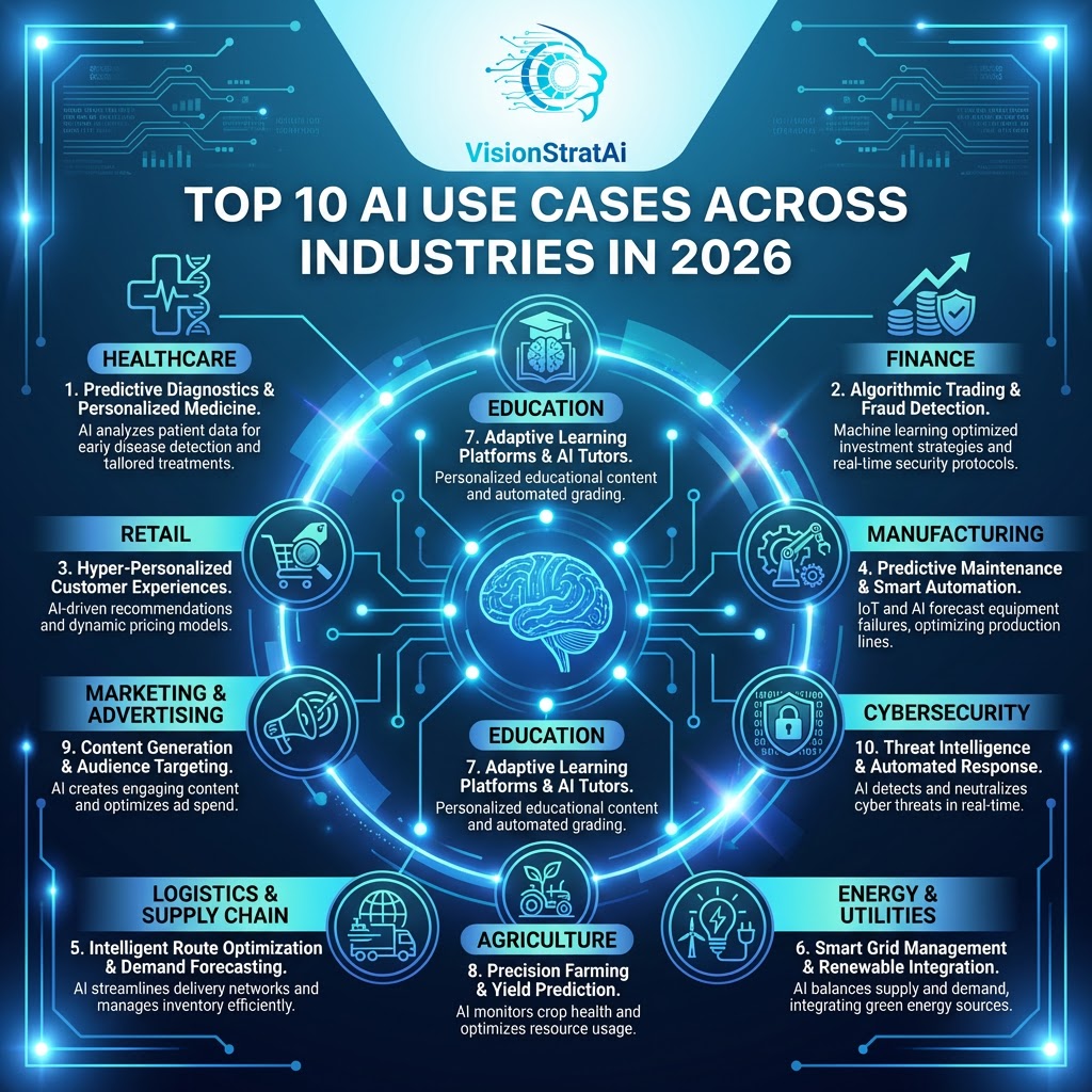 Top 10 AI Use Cases Across Industries in 2026 Introduction Artificial Intelligence (AI) continues to reshape industries at an unprecedented pace. In 2026, AI is no longer an experimental technology — it is a core driver of innovation, efficiency, and competitive advantage. From predictive analytics to intelligent automation, organizations across…